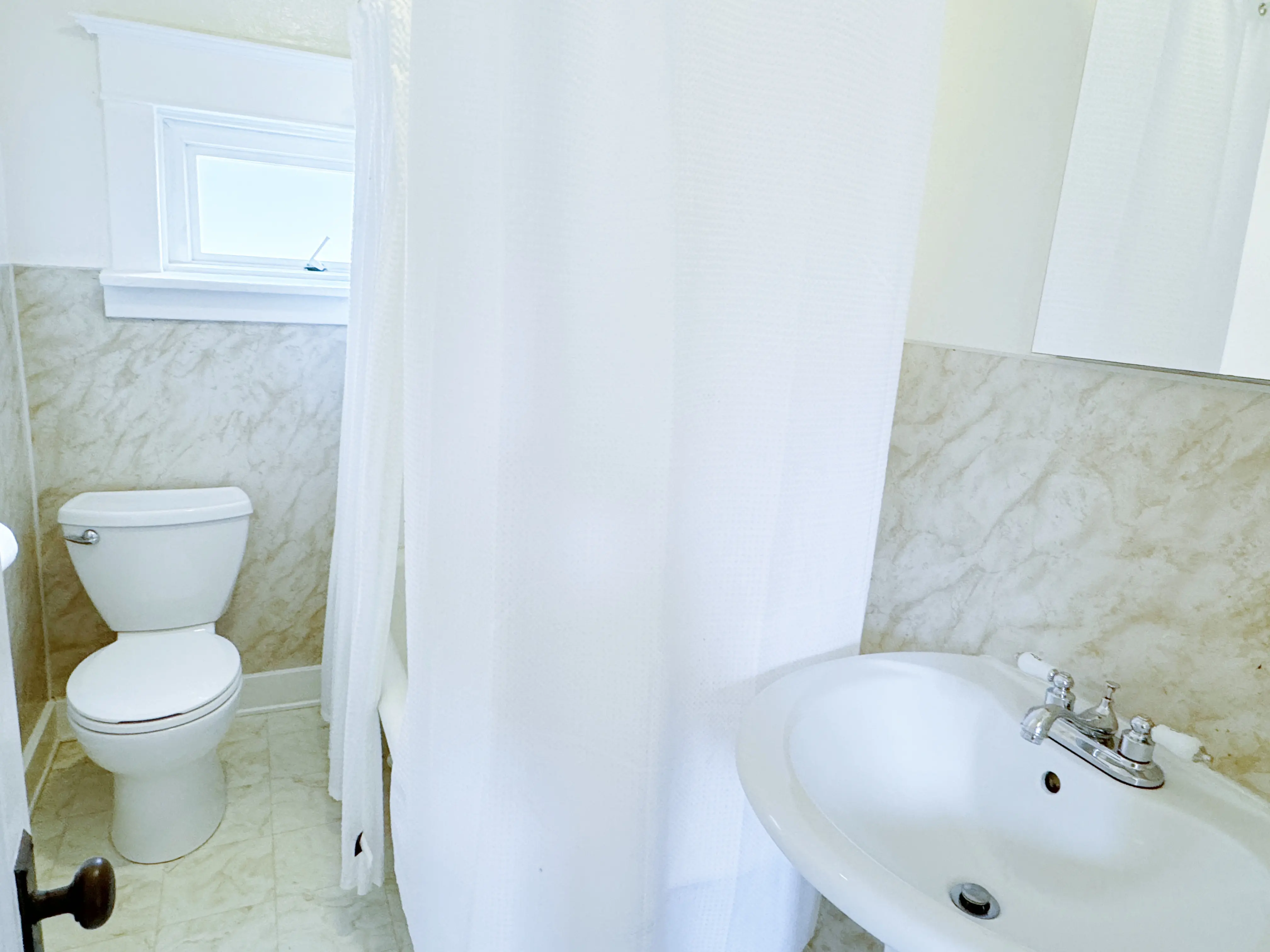The bathroom hosts a clawfoot soaking tub with shower and upgraded bathroom sink faucet.