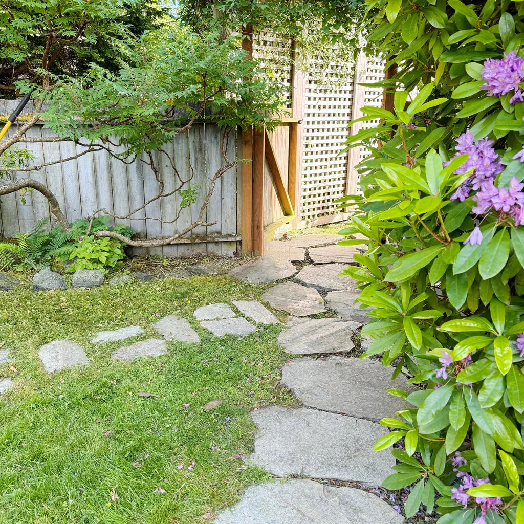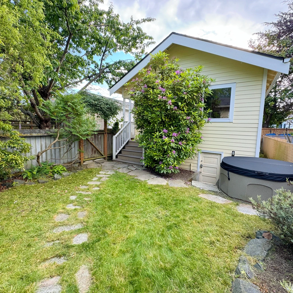 Enjoy the HOT TUB with views of the garden! The yard is fully fenced with honeysuckle flowers, rhododendrons, and curly willow. Parking is located directly next to the home, making it easy for unloading groceries!